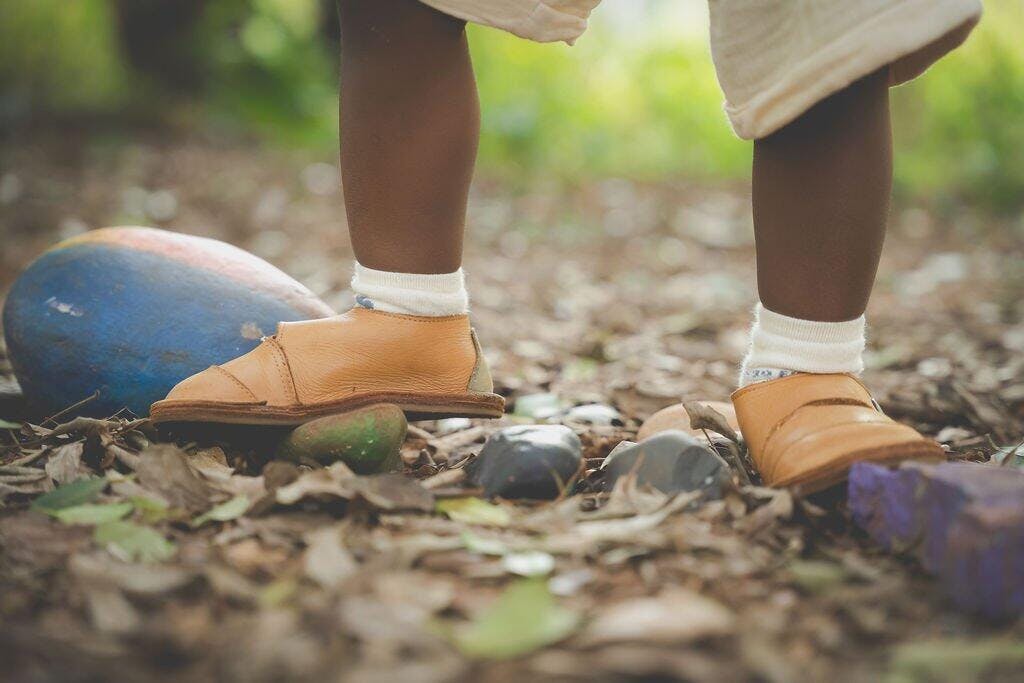 The latest range, Evergreen is developed with barefoot design principles - the Common Tread way. Improved design with the natural flexibility Common Tread is known for, but a more robust construction which stands the test of everyday climbing, riding, running, jungle gym adventures- fit for indoor and outdoor play. The tan leather upper is soft and moulds beautifully around little feet - the wider toe box allows room for growing, wiggling toes. The shoes are breathable, and can be worn without socks. The sole is soft, flat, flexible and zero-drop which creates a natural feel and enhances stability and agility when little ones are on the move. Easy velcro fastening with decorative press-stud - nurturing independence. Select either a green or pink back tag.